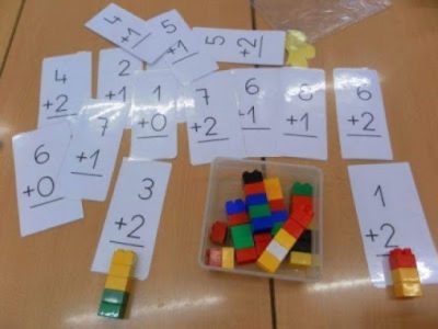 Explicación: En las hojas escribir varias sumas y recortarlas a modo de tarjetas. El niño deberá utilizar los legos para desarrollar las sumas y luego con un marcador escribirá el resultado en la tarjeta.